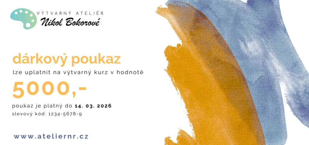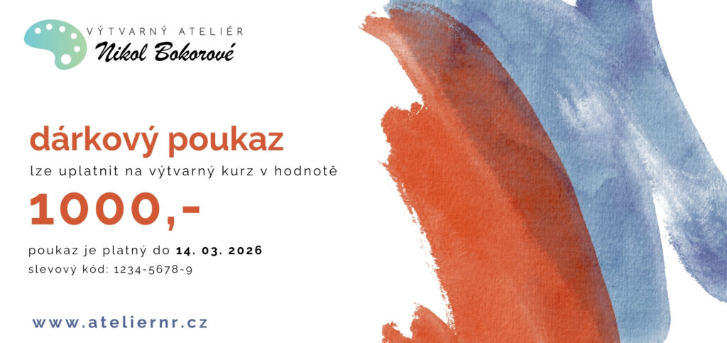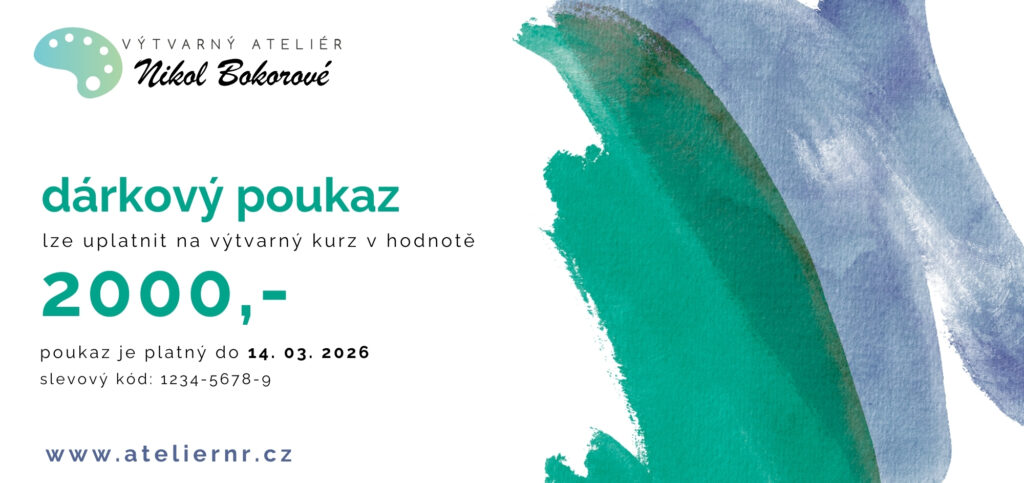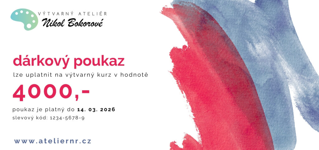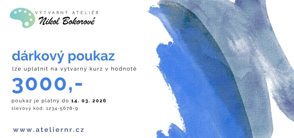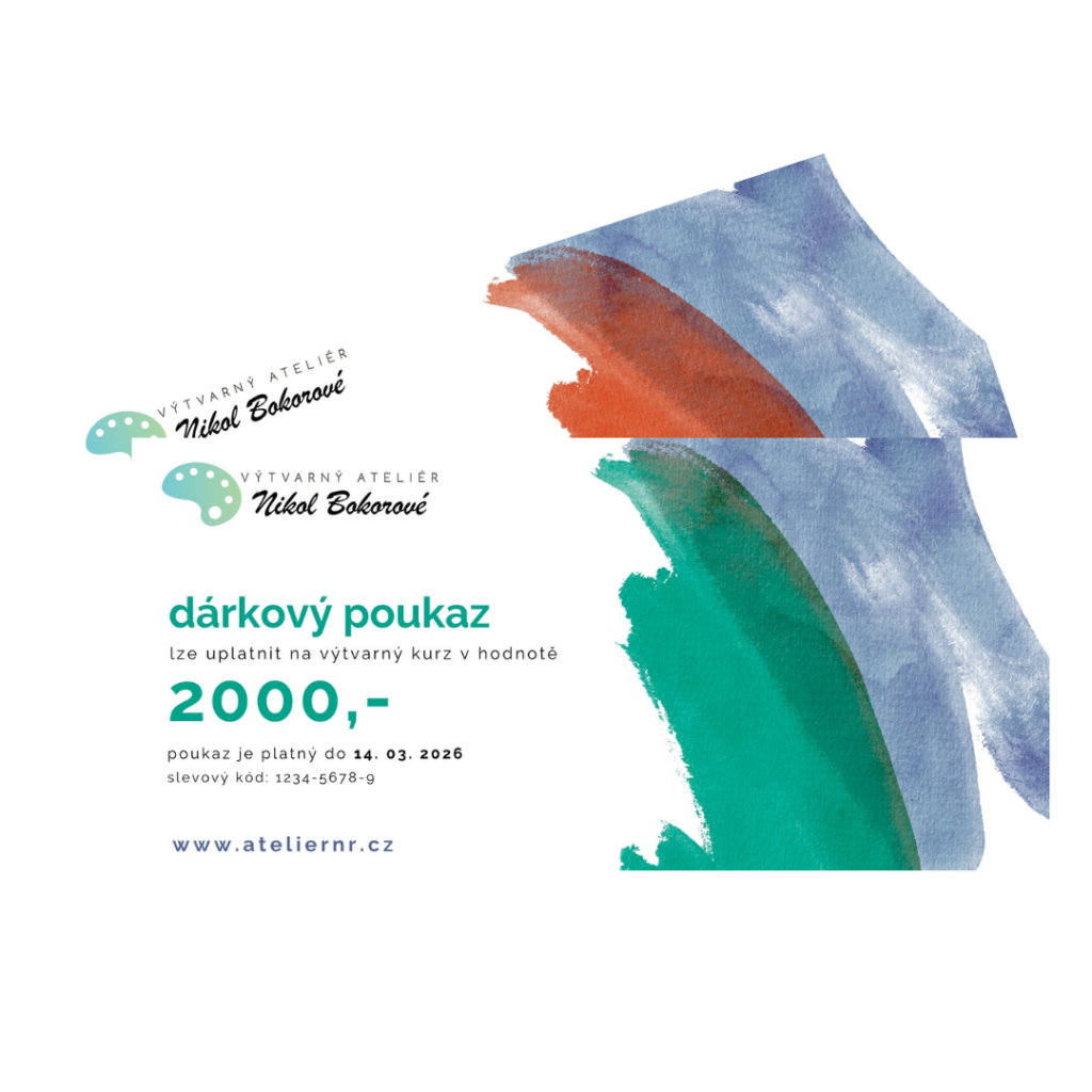 Dárkový voucher na výtvarný kurz zajisté potěší každého milovníka kresby a malby. Voucher můžete vybrat v různé finanční hodnotě. Poukaz lze využít jak na skupinové kurzy, tak na individuální lekce.